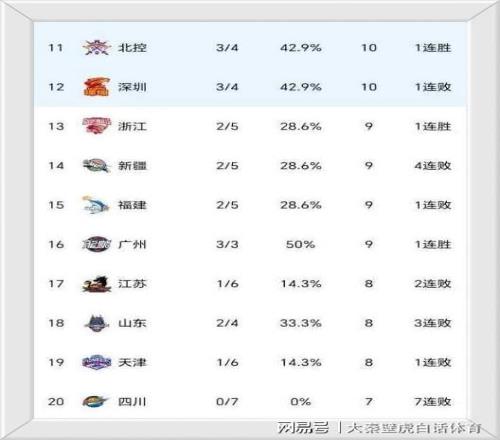 榜尾方面,7連敗的四川男籃倒數第一,6負1勝的天津隊和2勝4負的山東隊倒數二三。