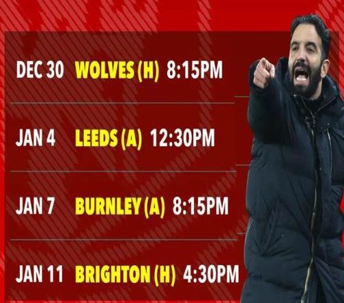 也就是說,接下來3場比賽,曼聯的對手都排在積分榜最后5位,這是阿莫林豪取執教以來首次四連勝的最佳機會!如果算上足總杯第三輪主場對布萊頓(英超第13位)的比賽,在1月中旬迎戰曼城的同城德比之前,球隊有機會實現各項賽事五連勝,讓球迷過個好年。
