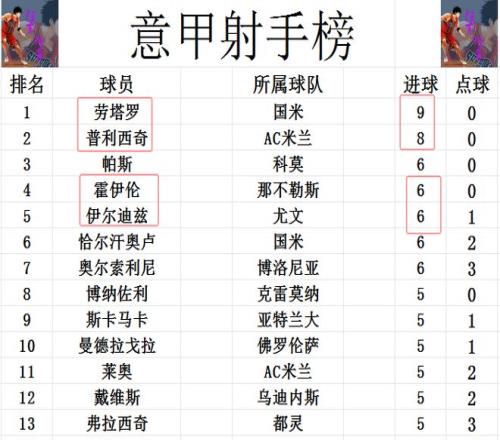 射手榜方面,勞塔羅打入制勝球,9球繼續(xù)領(lǐng)跑射手榜,射手榜第2也是AC米蘭,而且普利西奇也只差勞塔羅1球。霍伊倫梅開二度,追上伊爾迪茲,恰爾汗奧盧和奧爾索里尼,6球并列第3。