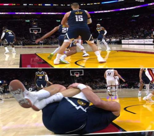 從慢鏡頭回看,小哈克斯持球突破,斯賓塞·瓊斯重心失衡,整個人往后退了一步;就是這沒有任何惡意的一步,卻異常精準的直接踩在了約基奇左腳上。