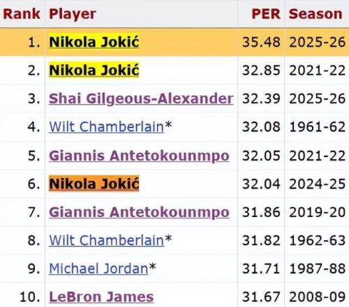 個人PER值高達35.48,放眼NBA歷史更是斷檔的領先第一,而在他身后的歷史第二,還是約基奇。