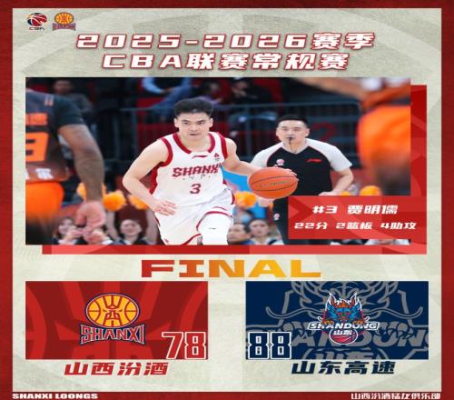 北京時間2025年12月30日19:35,2025-2026賽季CBA聯賽第八輪繼續進行,山西汾酒赴客場挑戰山東高速。兩隊歷史上共交手40次,山西汾酒14勝26負,上賽季常規賽兩隊交手2次,山西汾酒2勝0負。本場比賽,山西隊狀態低迷,特別是上半場,進攻猶豫、防守松懈,籃板球保護不佳;中場調整后雖有所改善,但由于此前落后過多,最終無力翻盤,全場比賽結束,山西汾酒78:88不敵山東高速。