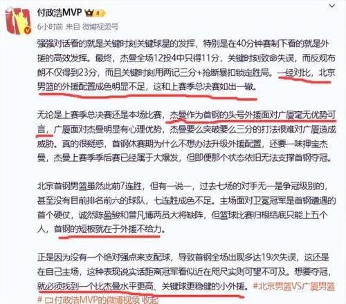 說到外援名記付政浩更是一針見血,怒批北京隊,他表示,一經(jīng)對比,北京男籃的外援配置成色明顯不足,這和上賽季總決賽如出一轍。他明確指出,首鋼的短板就在于外援不給力。他對北京隊的休賽期的操作感到不解,“CBA已經(jīng)連續(xù)兩個賽季施行外援四節(jié)七人次了,外援的重要性無須再贅言,我就沒明白,為什么不要預(yù)算花在找靠譜的外援身上呢。就現(xiàn)在CBA這些本土球員,哪個能打出外援水準呢?看不懂”付政浩不但幫北京隊把脈,還給北京隊提出了解決問題的辦法,他指出,想要奪冠,就必須找到一個比杰曼水平更高、關(guān)鍵球更穩(wěn)健的小外援。