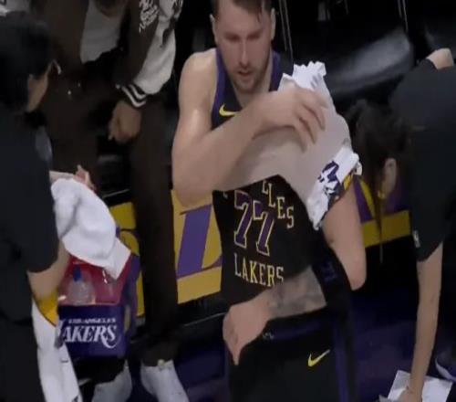 東契奇第三節下場后走回更衣室,目前已回到替補席肩部戴上了冰敷,受傷了?