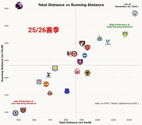 從本賽季英超球隊跑動質量來看,切爾西的沖刺跑距離和總跑動距離都是倒數第一,當然這一點跟球隊頻繁拿到紅牌,相當一部分比賽10打11有關,導致數據平均時變少(總數據是10人作戰,平均時依舊除以11人)。