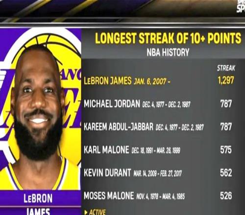 五、連續得分上雙紀錄1297場:歷史第一的“穩定之王”