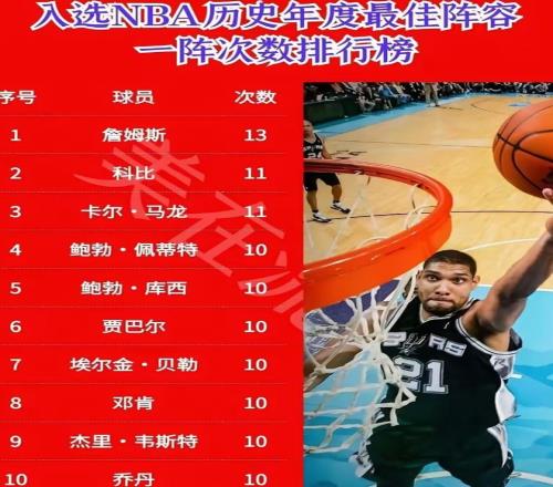 最佳一陣是NBA常規賽個人榮譽的頂級象征,代表著球員在當賽季的表現處于聯盟頂級水平。詹姆斯的職業生涯中,累計獲得了13次最佳一陣,遠超排名第二的科比和馬龍(均為11次),成為NBA歷史上獲得最佳一陣次數最多的球員。