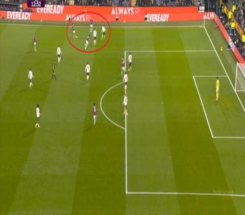 但曼聯被打穿肋部是顯而易見的事實,而且在局部,你可以看到曼聯實際上陷入了二防三的情況,卡塞米羅無法同時防對手傳球和跑位: