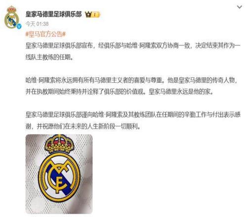 官方公告中表示,經俱樂部與哈維-阿隆索雙方協商一致,決定結束其作為一線隊主教練的任期。